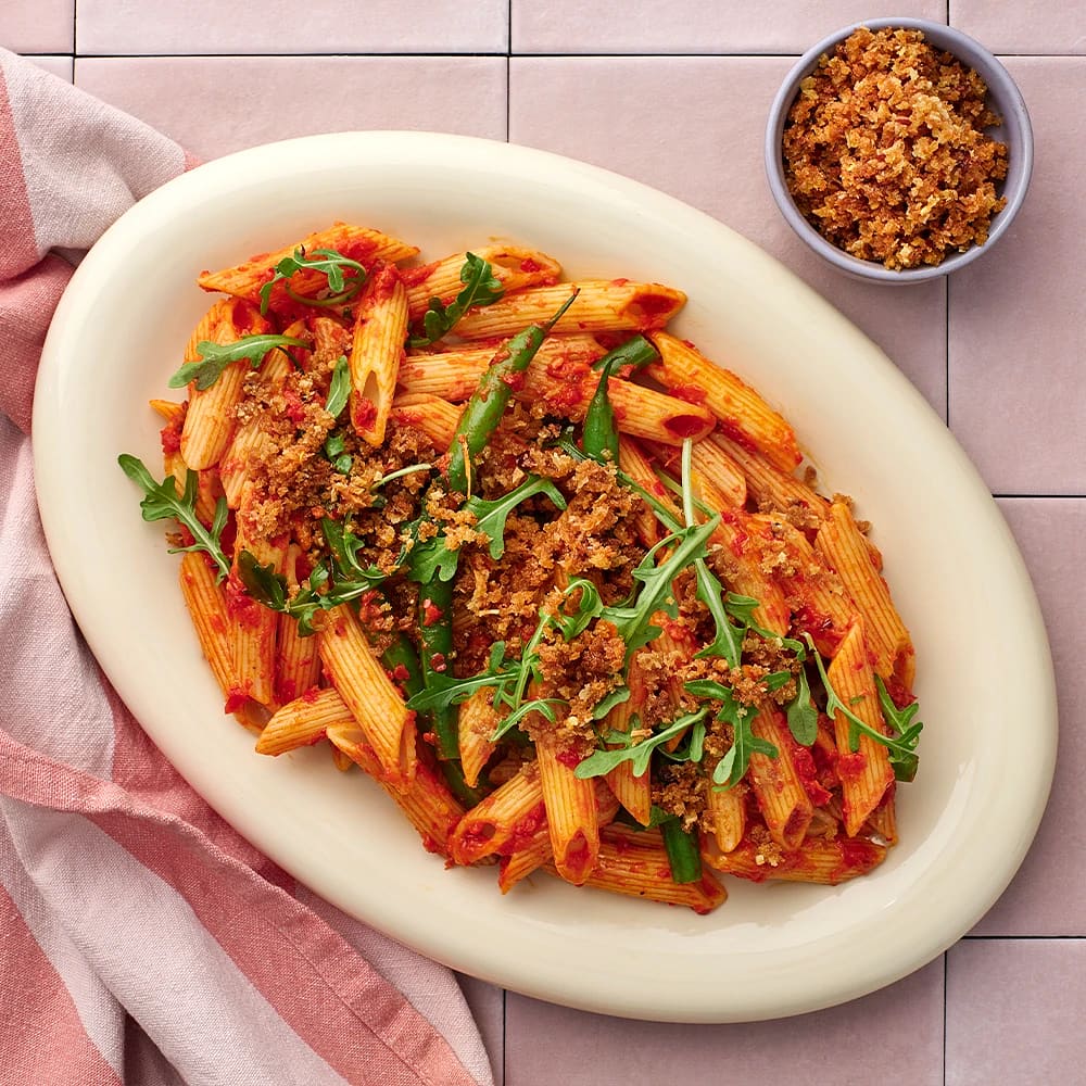 Paprikapasta med haricots verts och brödcrunch