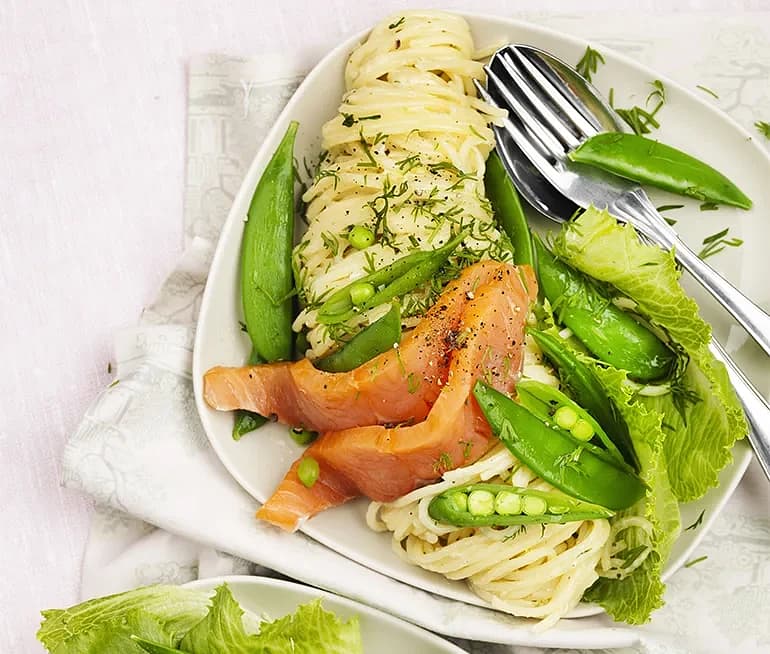 Pasta med rökt lax och salladsärter
