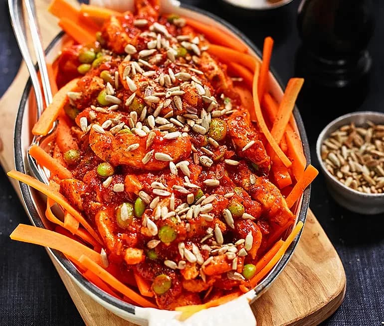 Morotspasta med ajvar och kalkon