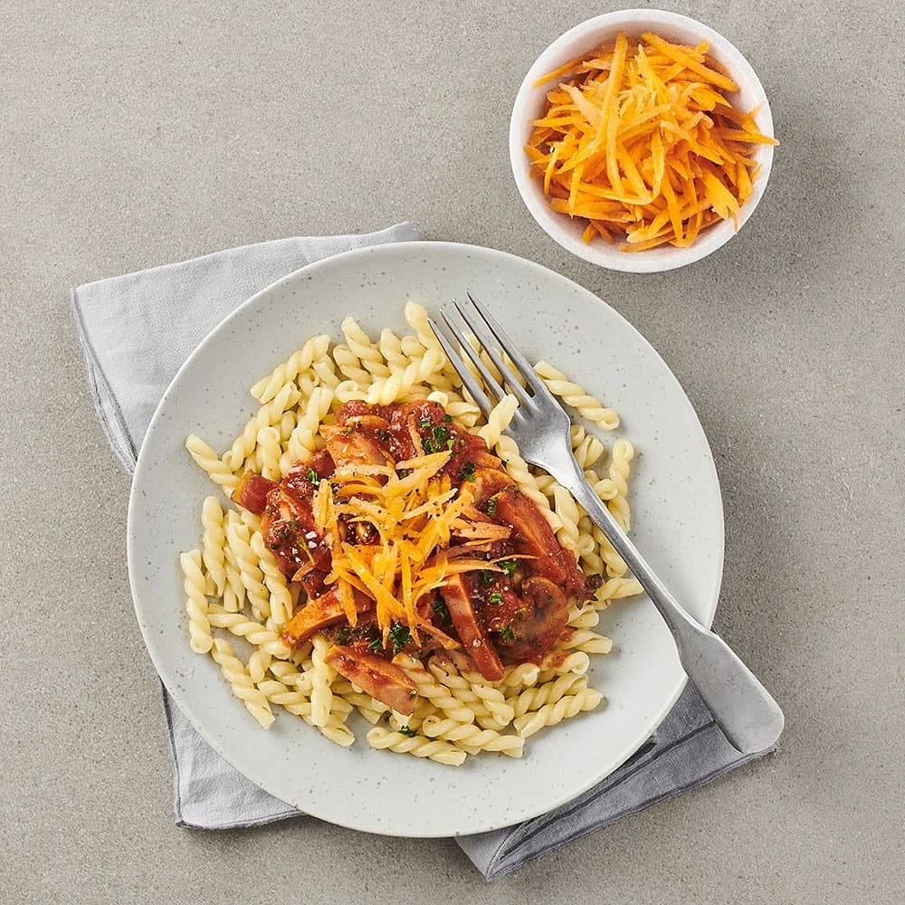 Fusilli med bacon, röd paprika och purjo