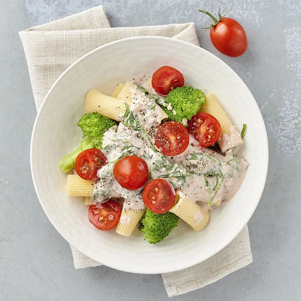 Stuvade makaroner med vegobollar och broccoli