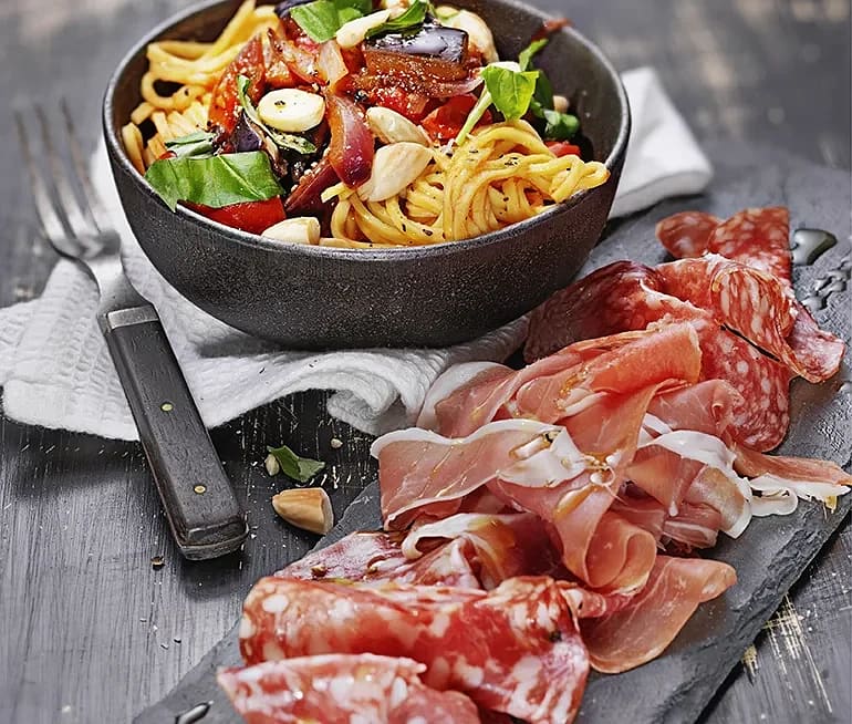 Pasta med vaxbönor och lufttorkad skinka