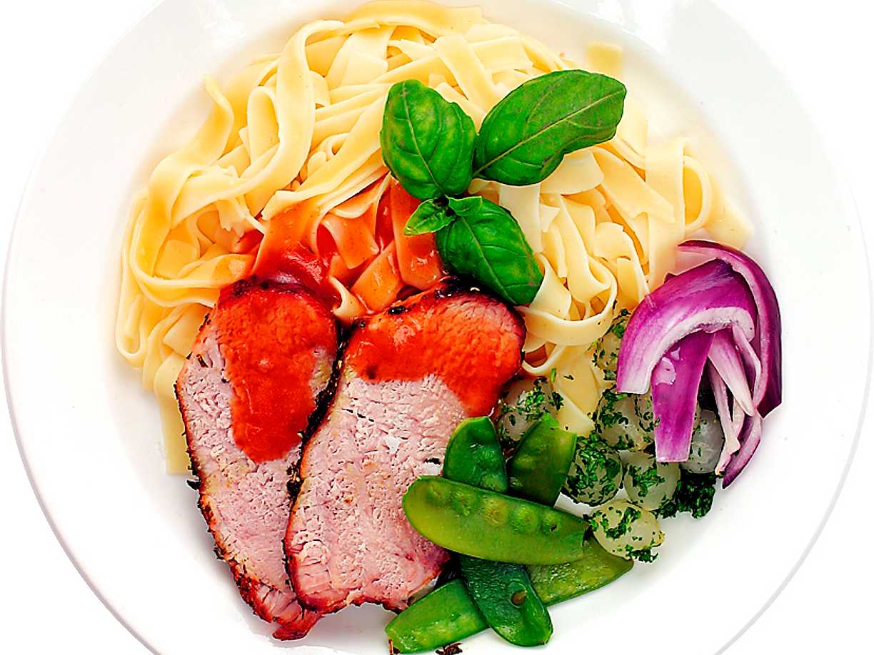 Helstekt fläskytterfilé med pasta och grönsaker
