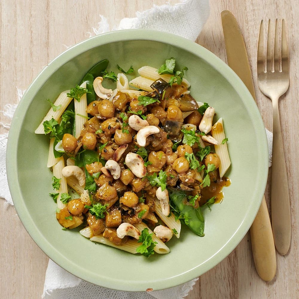 Bönpasta med tomatsås och honungsrostade grönsaker