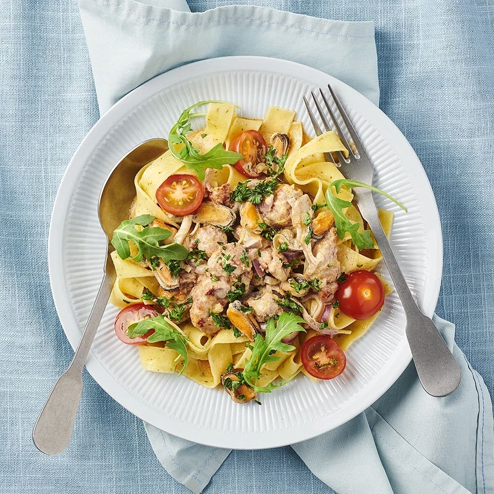 Barilla Fusilli pasta med en krämig tomatsås med svamp