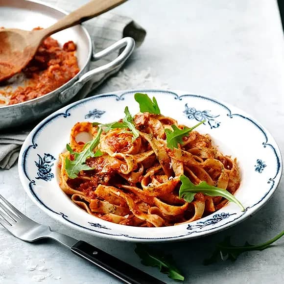 Tagliatelle med bacon och tomatsås