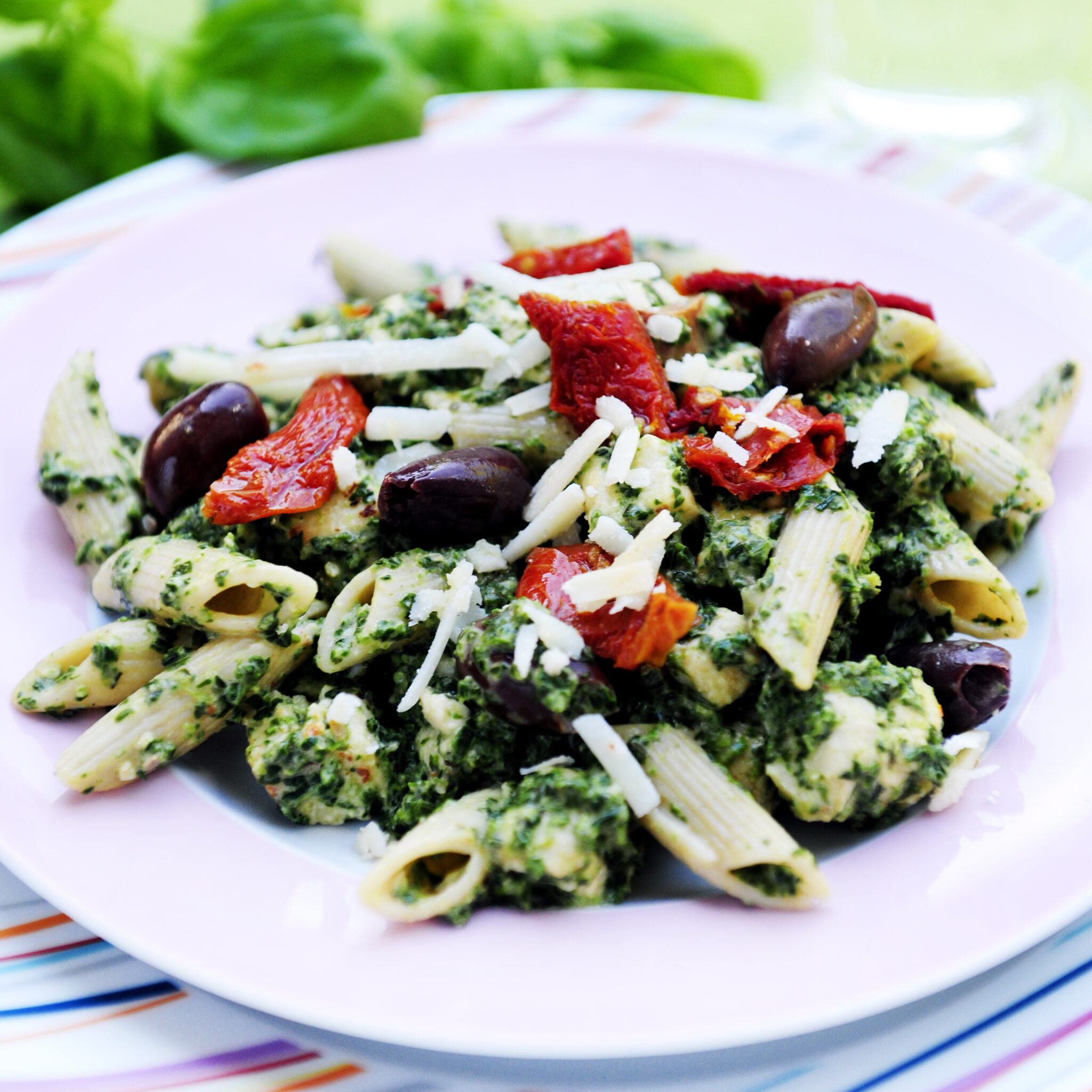 Pasta med pesto och marinerade soltorkade tomater