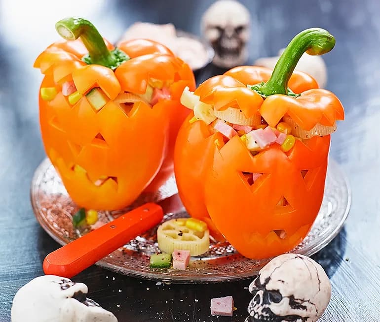 Halloweenpaprikor fylld med pastasallad