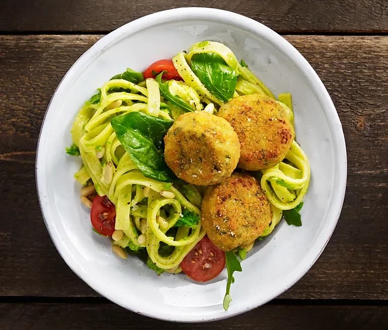 Ricottabiffar med pastasallad och ärtpesto