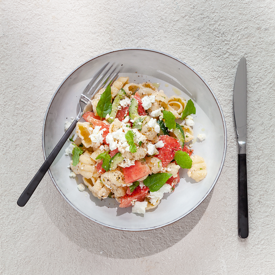Pastasallad med vattenmelon och fetaost