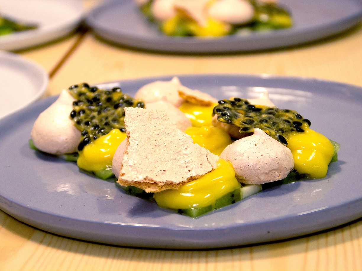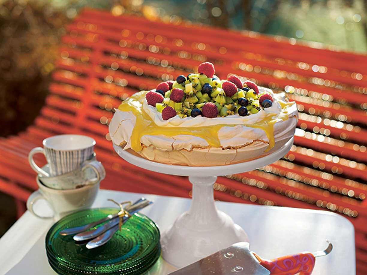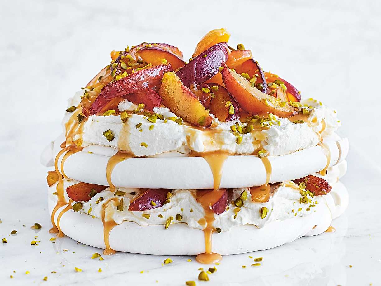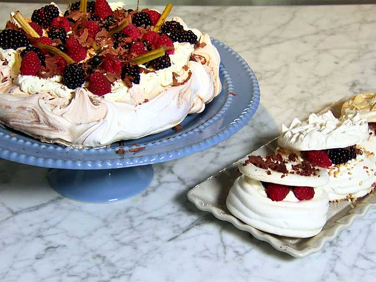 Pavlova med rabarbercurd och honungsrostade hasselnötter