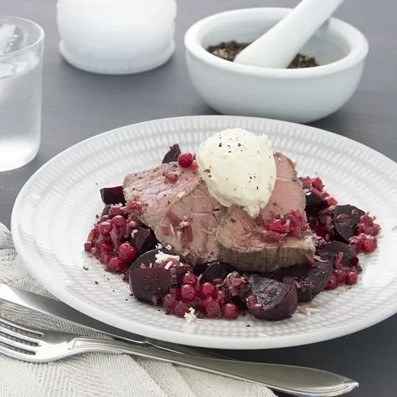 Rådjurstek med rödbetor i lingonvinägrett och pepparrotsgrädde