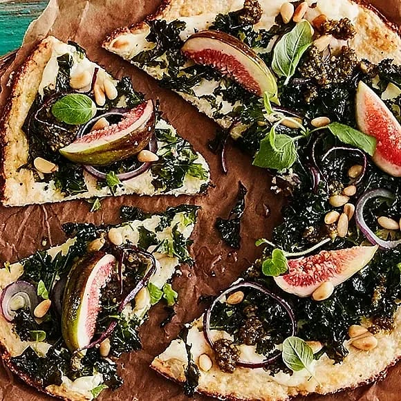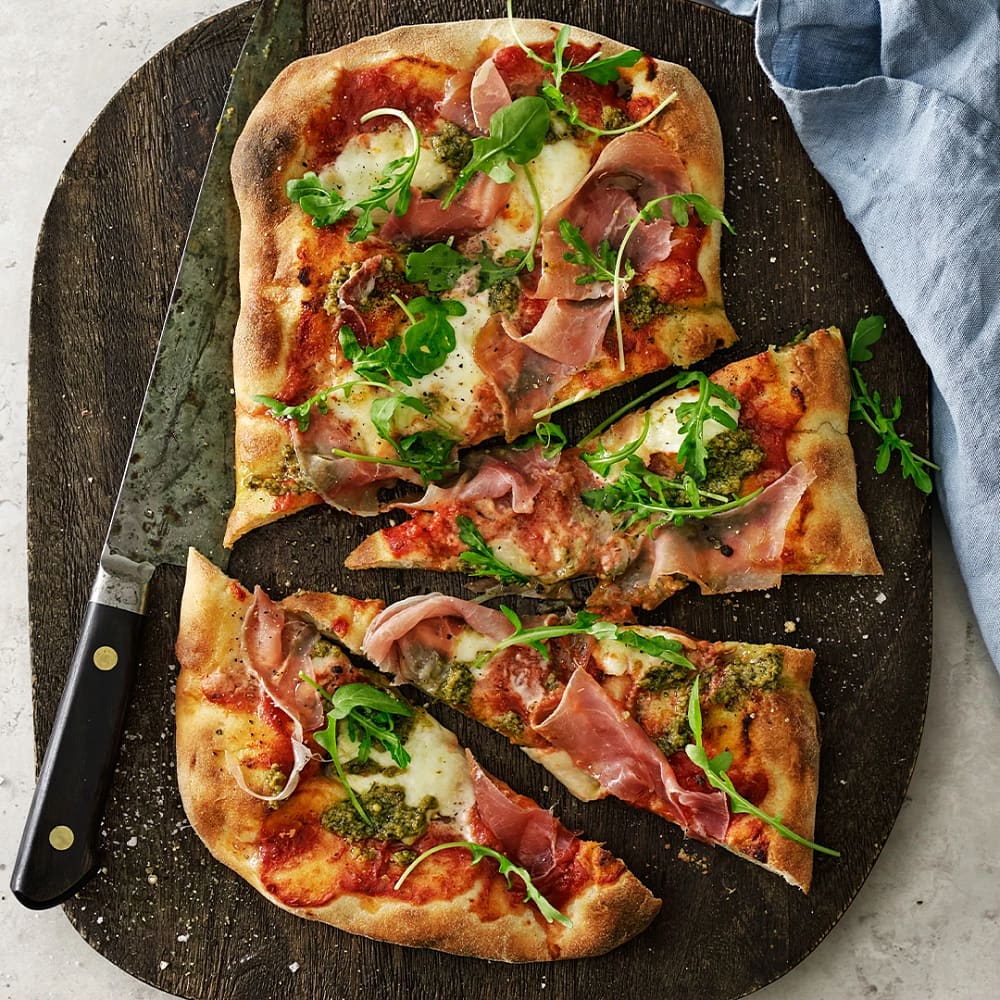Vegetarisk pizza med pesto, mozzarella och pecorino