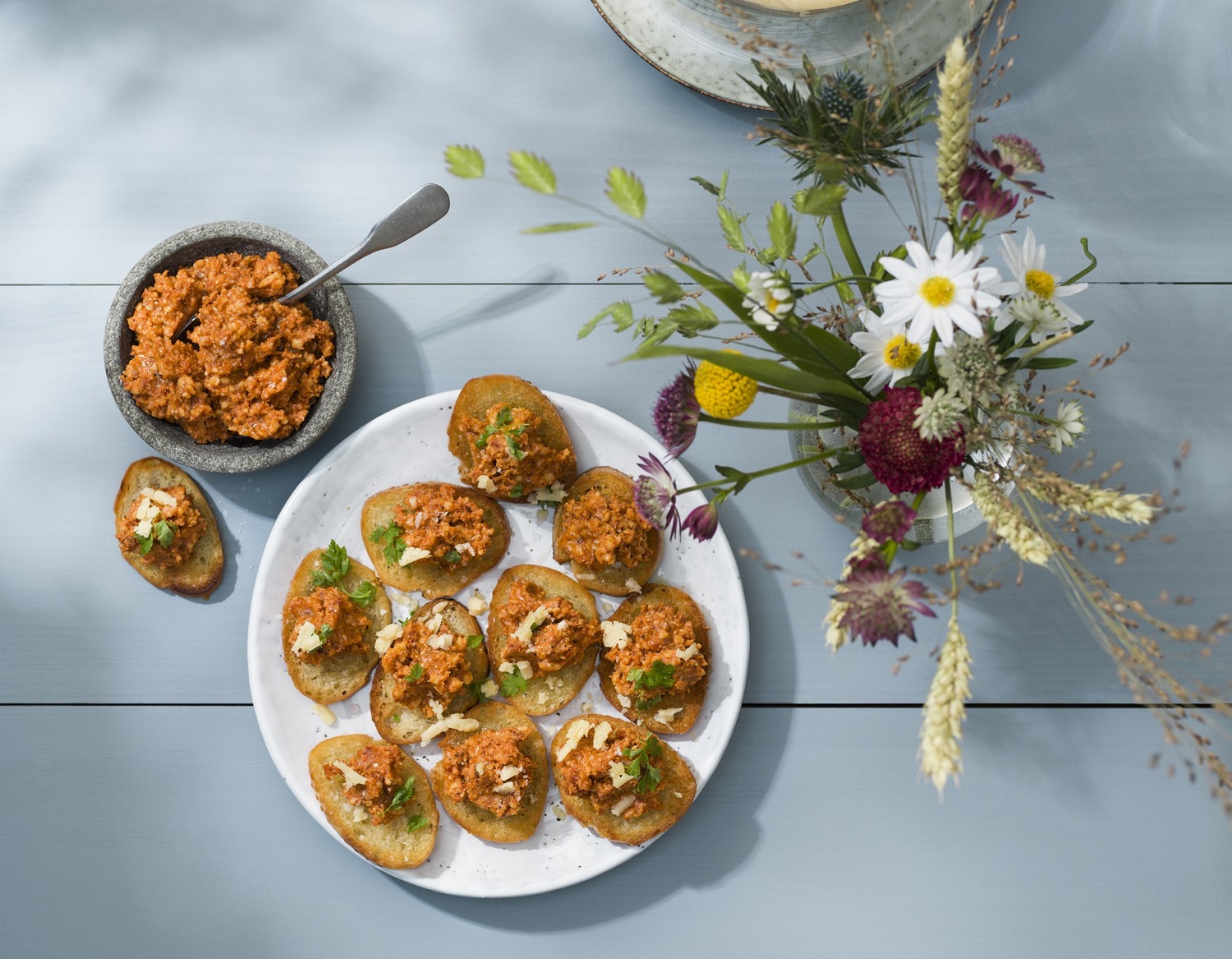Italiensk smörgåstårta med pesto och soltorkade tomater