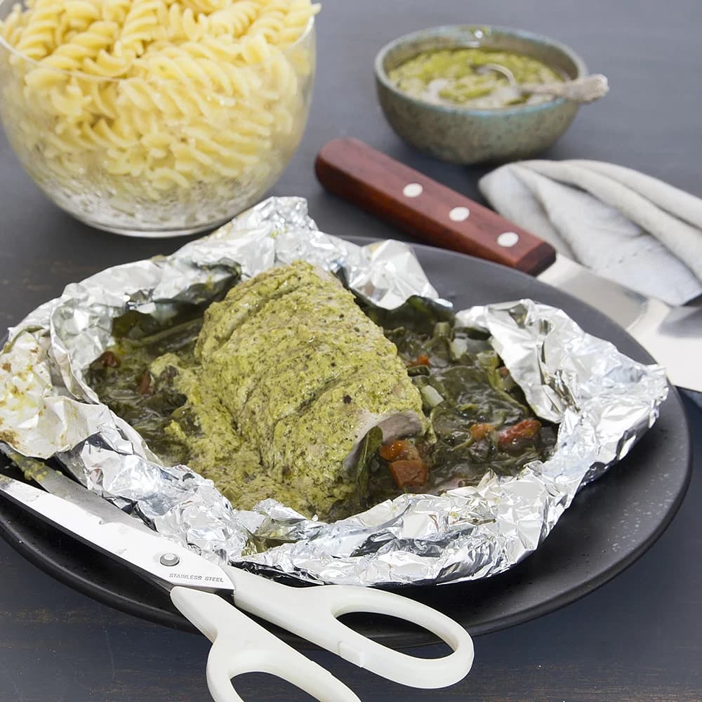 Torsk i folie med tomat, pesto och purjolök