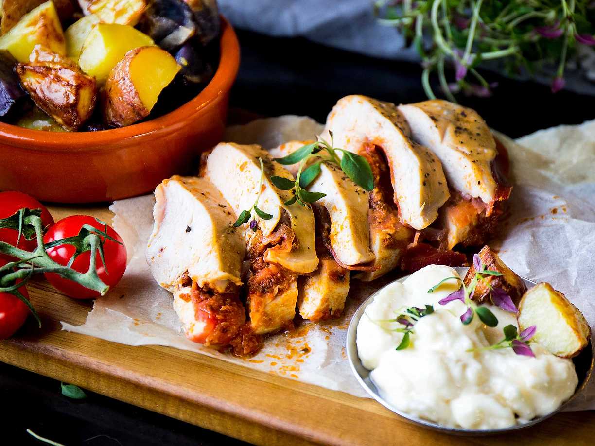 Pesto- och prosciuttofylld kyckling med patata bravas