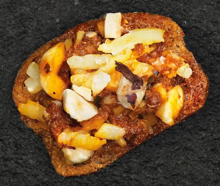 Crostini med röd pesto, hasselnötter och Västerbottensost