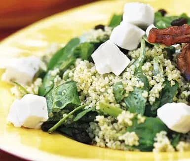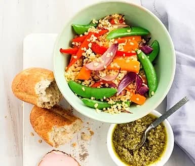 Rostad grönsaksbulgur med pastramikassler och pesto