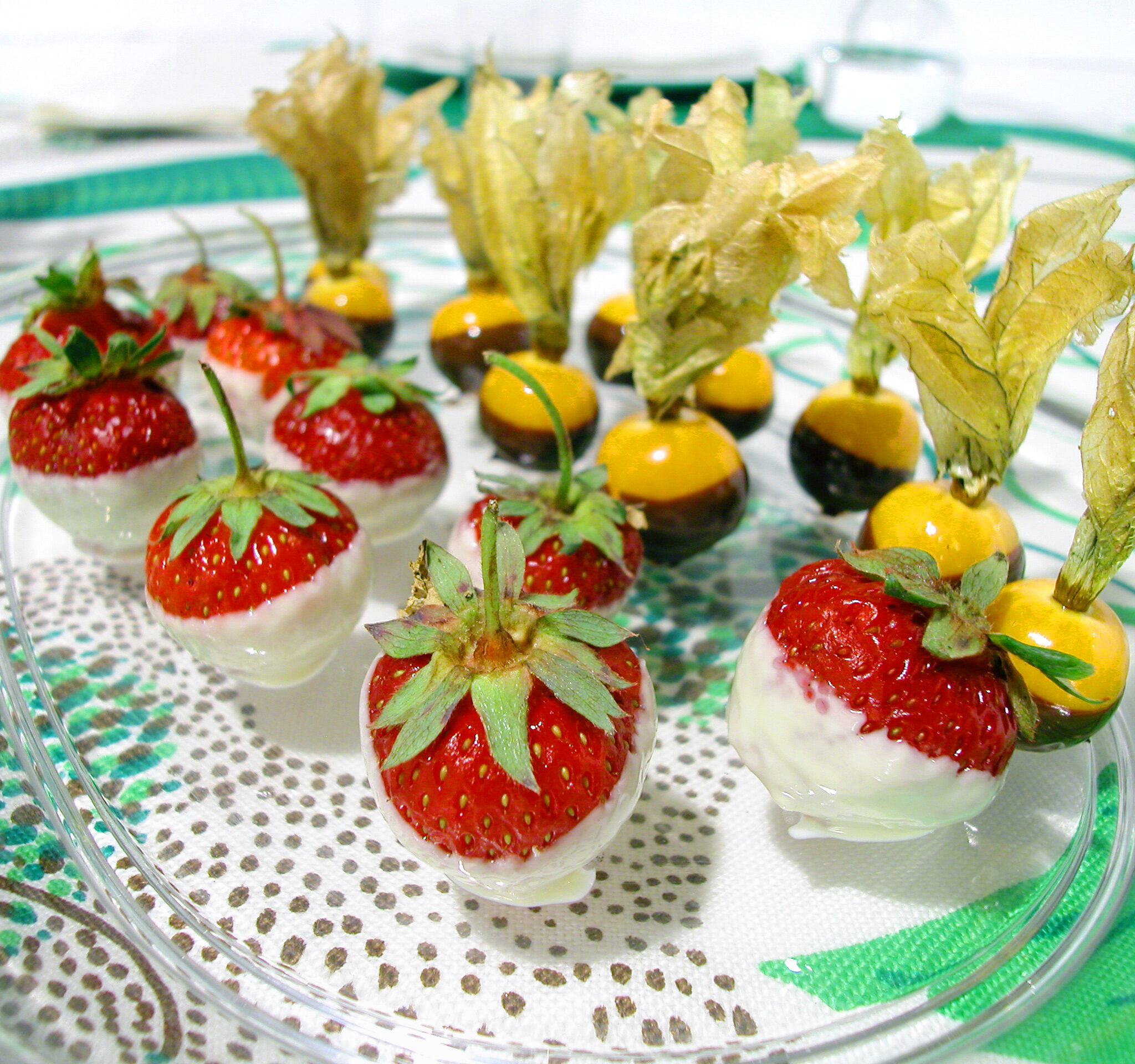 Kladdkaka med kaktus- och hallonsorbet, färska jordgubbar, kiwi och physalis
