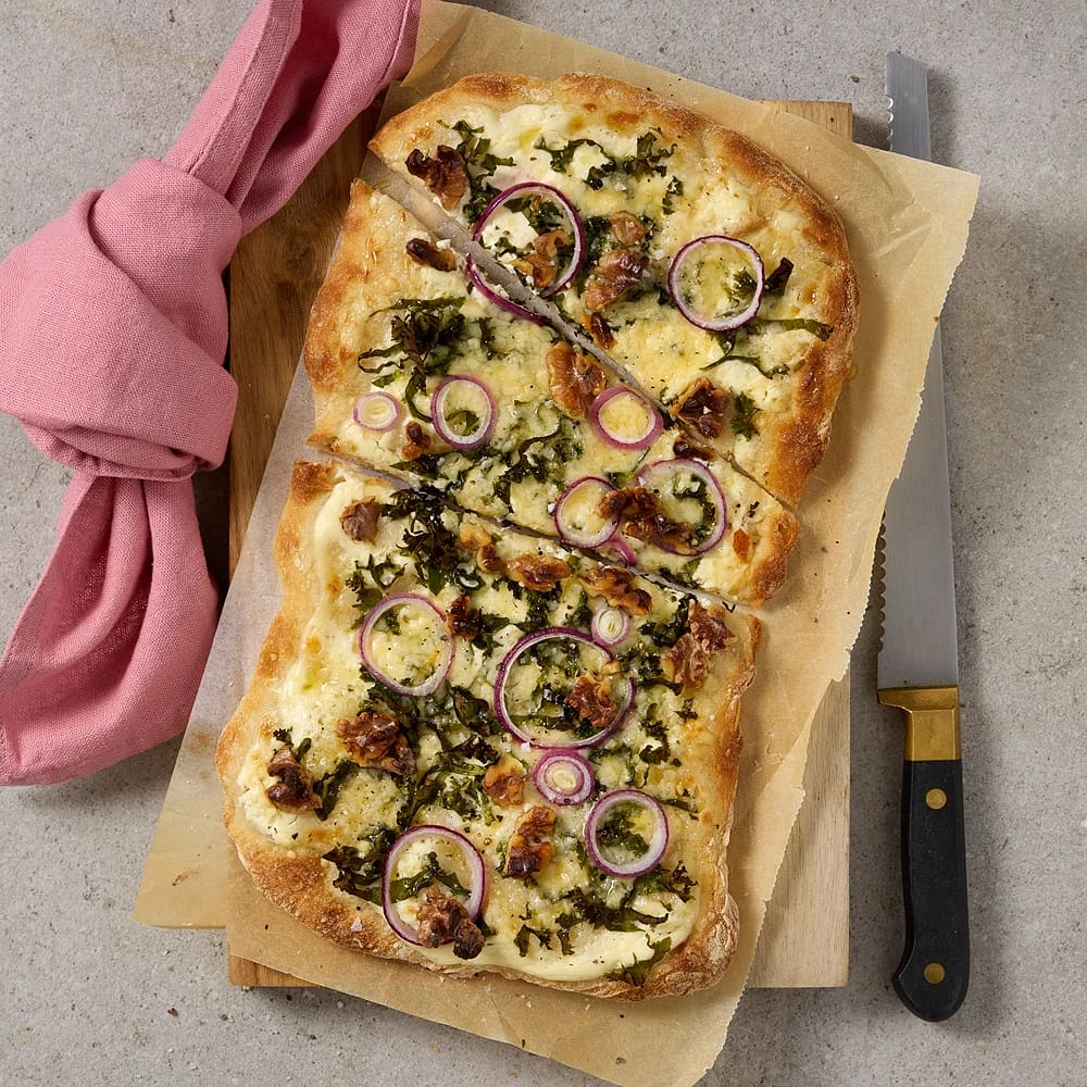 Vit pinsa med crème fraiche, folkeost och valnötter
