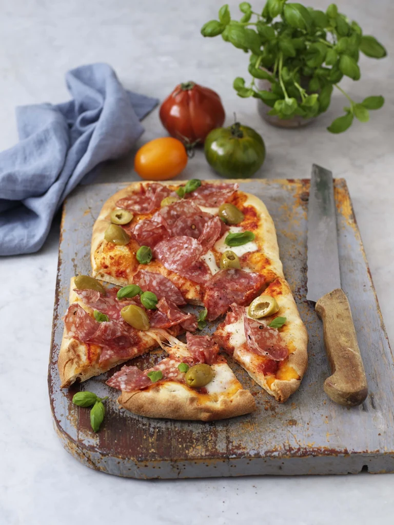 Pinsa med salami och oliver