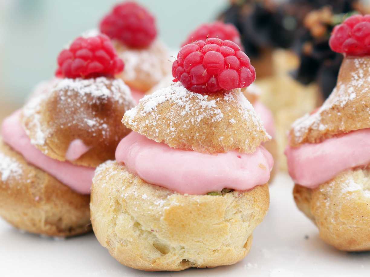 Chokladcrème med björnbär doppade i vit choklad och pistage
