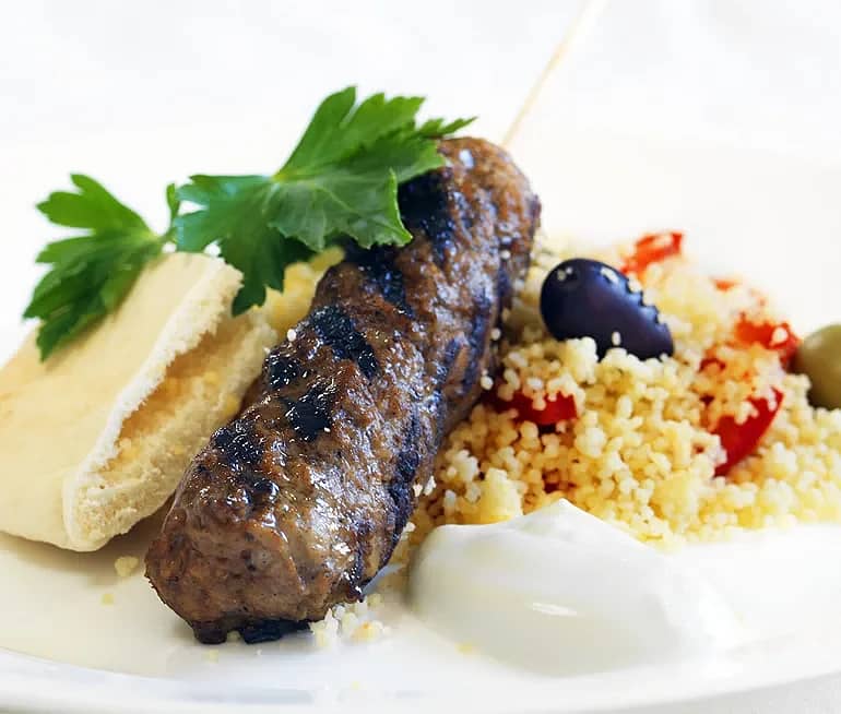 Kebabspett med couscous, pitabröd och yoghurt