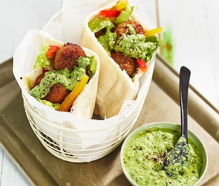 Kikärtsbollar med grön dipp i pitabröd