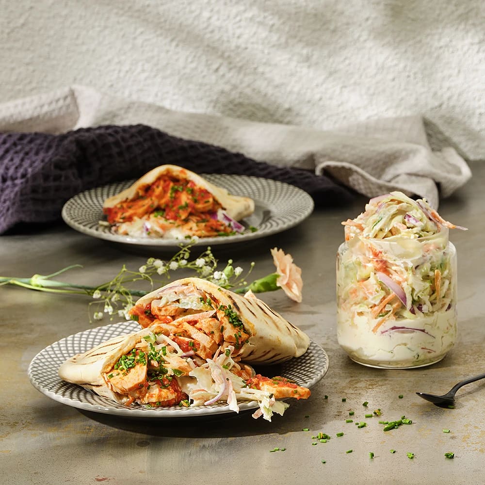 Kyckling i pitabröd med coleslaw på primörer