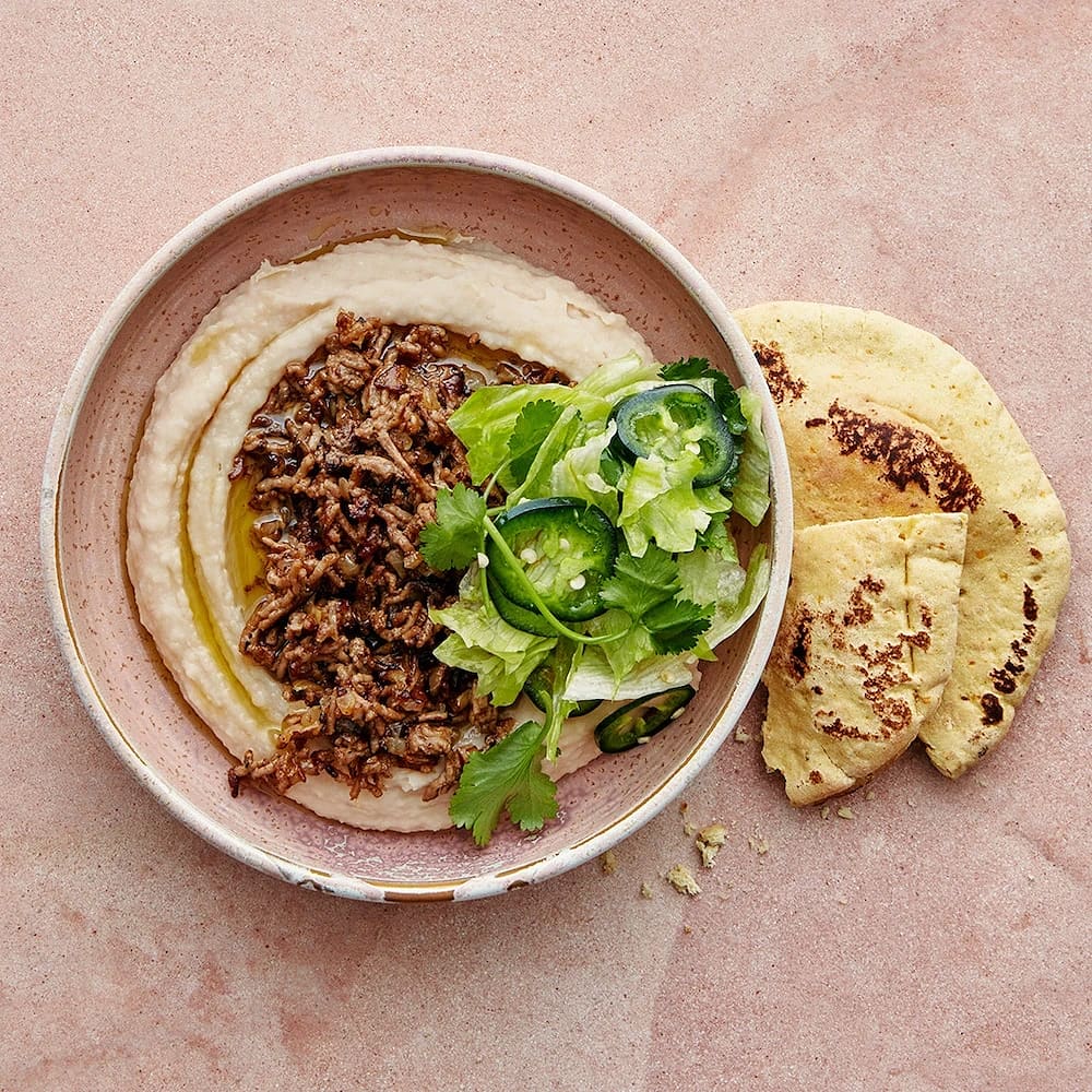 Hummus med lammfärs, pinjenötter och pitabröd
