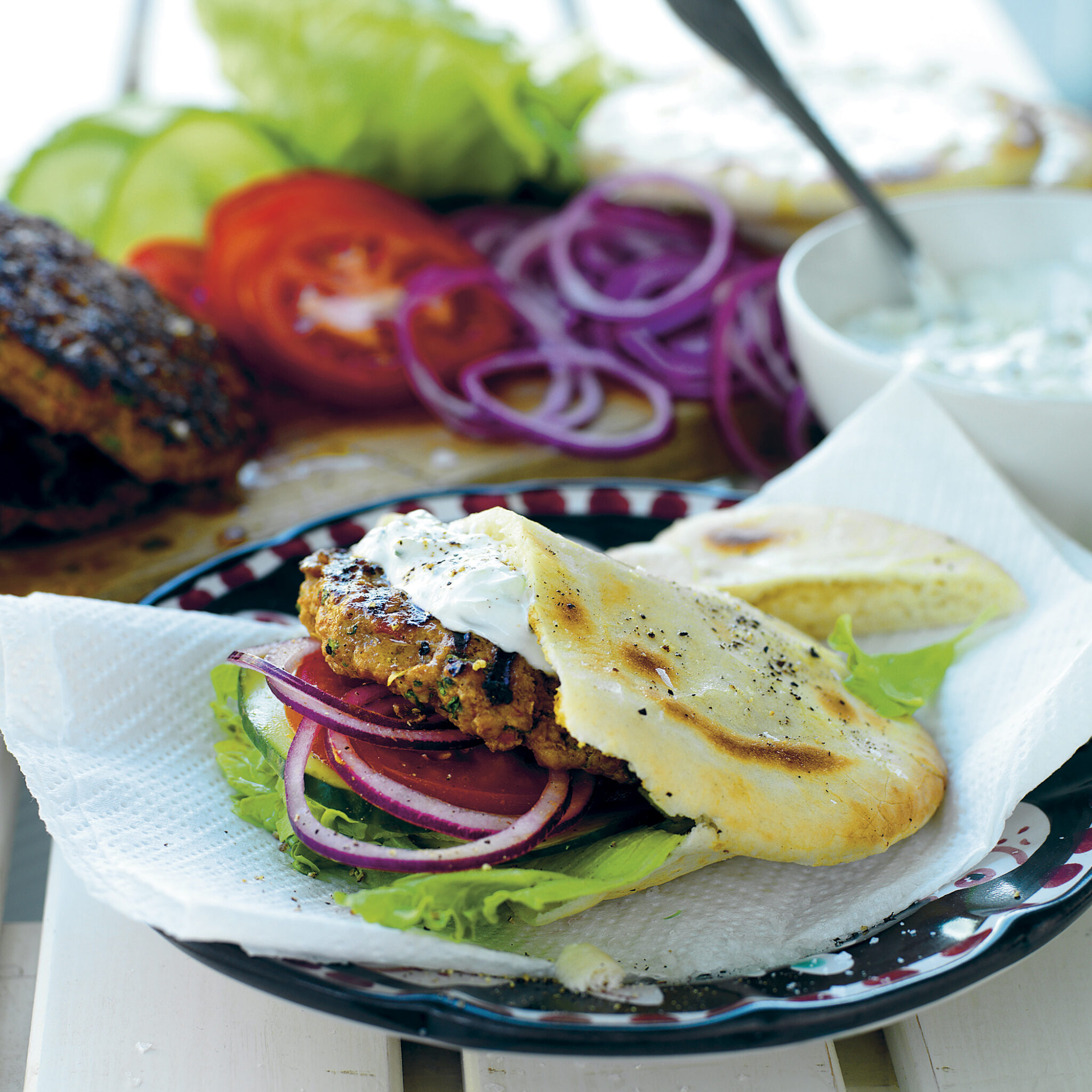 Kebab på kycklingfärs med pitabröd och paprikayoghurt