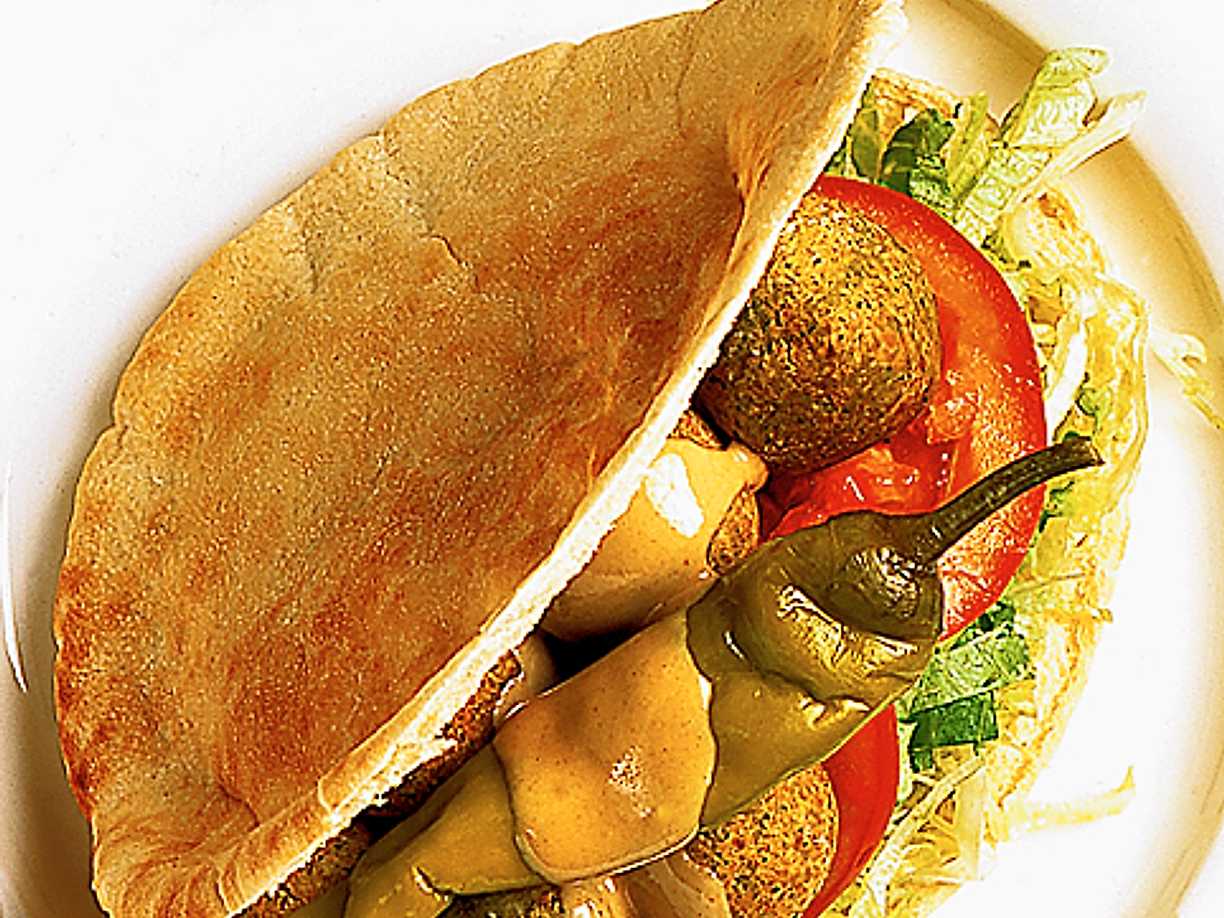 Falafel i pitabröd med spetspaprika