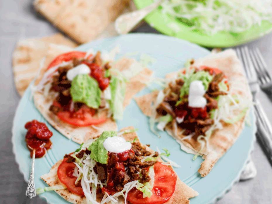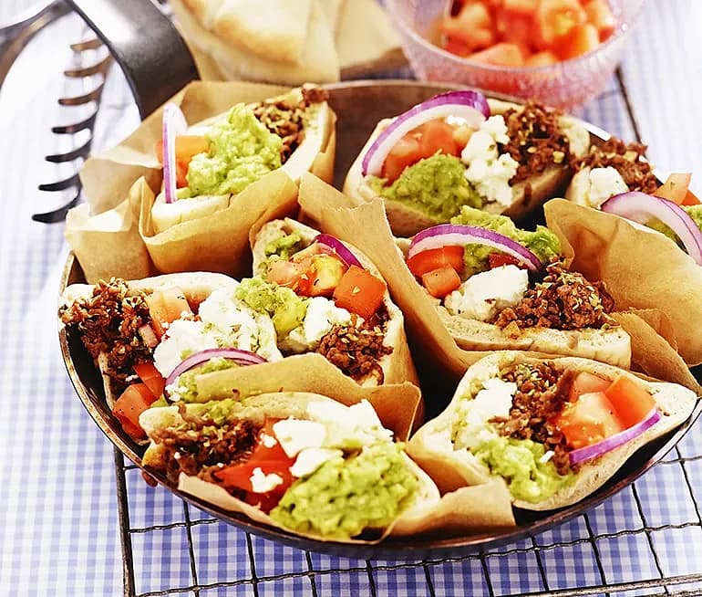 Hemmagjord kebab i pitabröd med avokadoröra och tomatsalsa