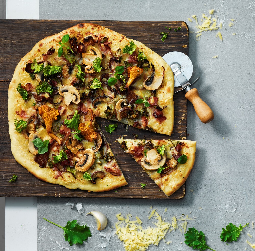 Pizza Bianca med kastanjechampinjoner, hyvlad halloumi och lufttorkad skinka