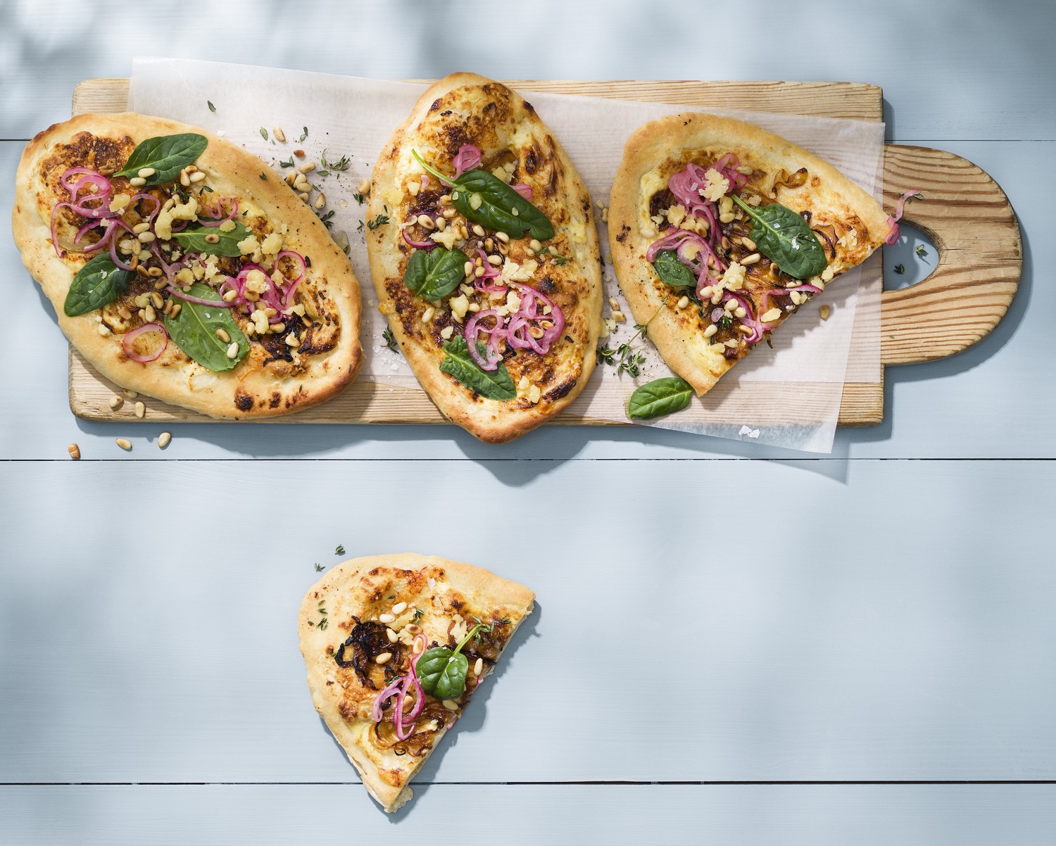 Pizza bianca med soltorkade tomater, vitost och rödlök
