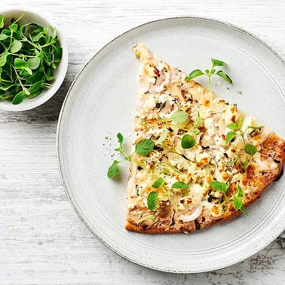 Pizza bianco med olivcrème fraiche, fetaost och oregano