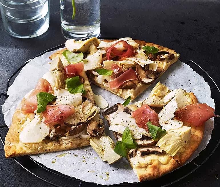 Pizza Bianca med kastanjechampinjoner, hyvlad halloumi och lufttorkad skinka