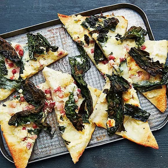 Pizza bianco med grönkål, bacon och syrad lök