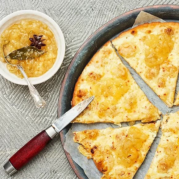 Pizza bianco med chiliost och päronchutney