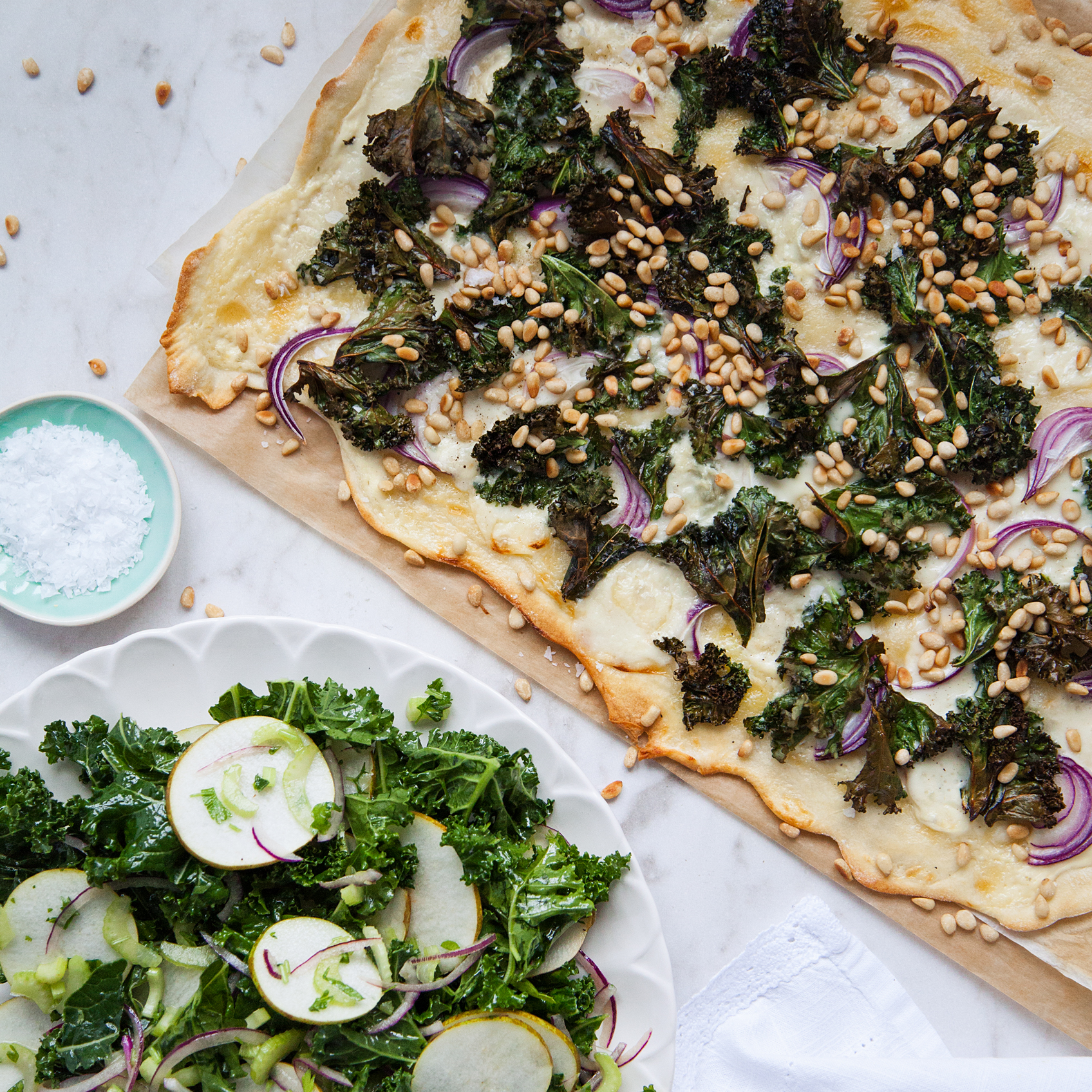 Gorgonzolapizza med grönkål och pinjenötter