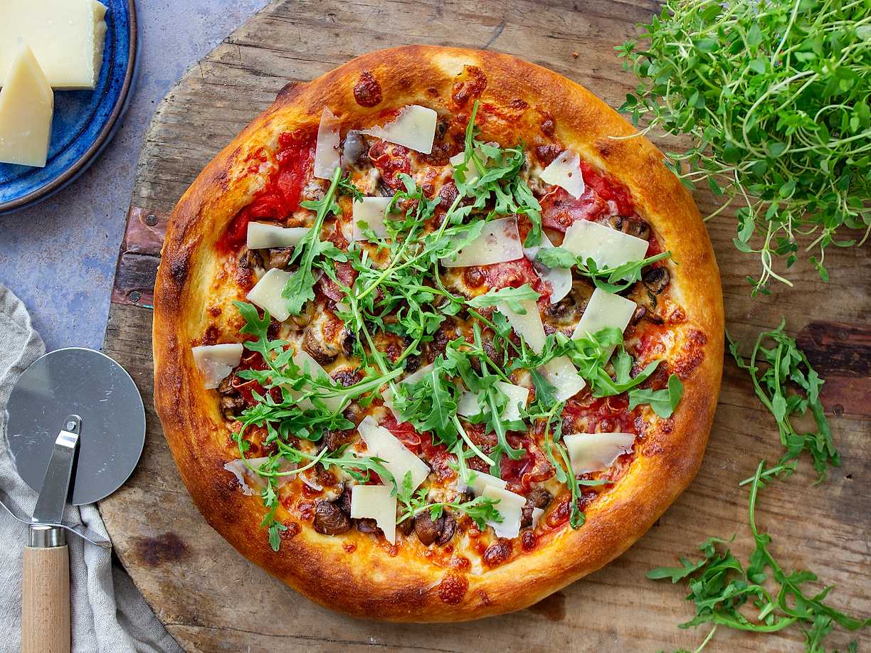 Krispig pizza med tomatsås, mozzarella och prosciutto crudo