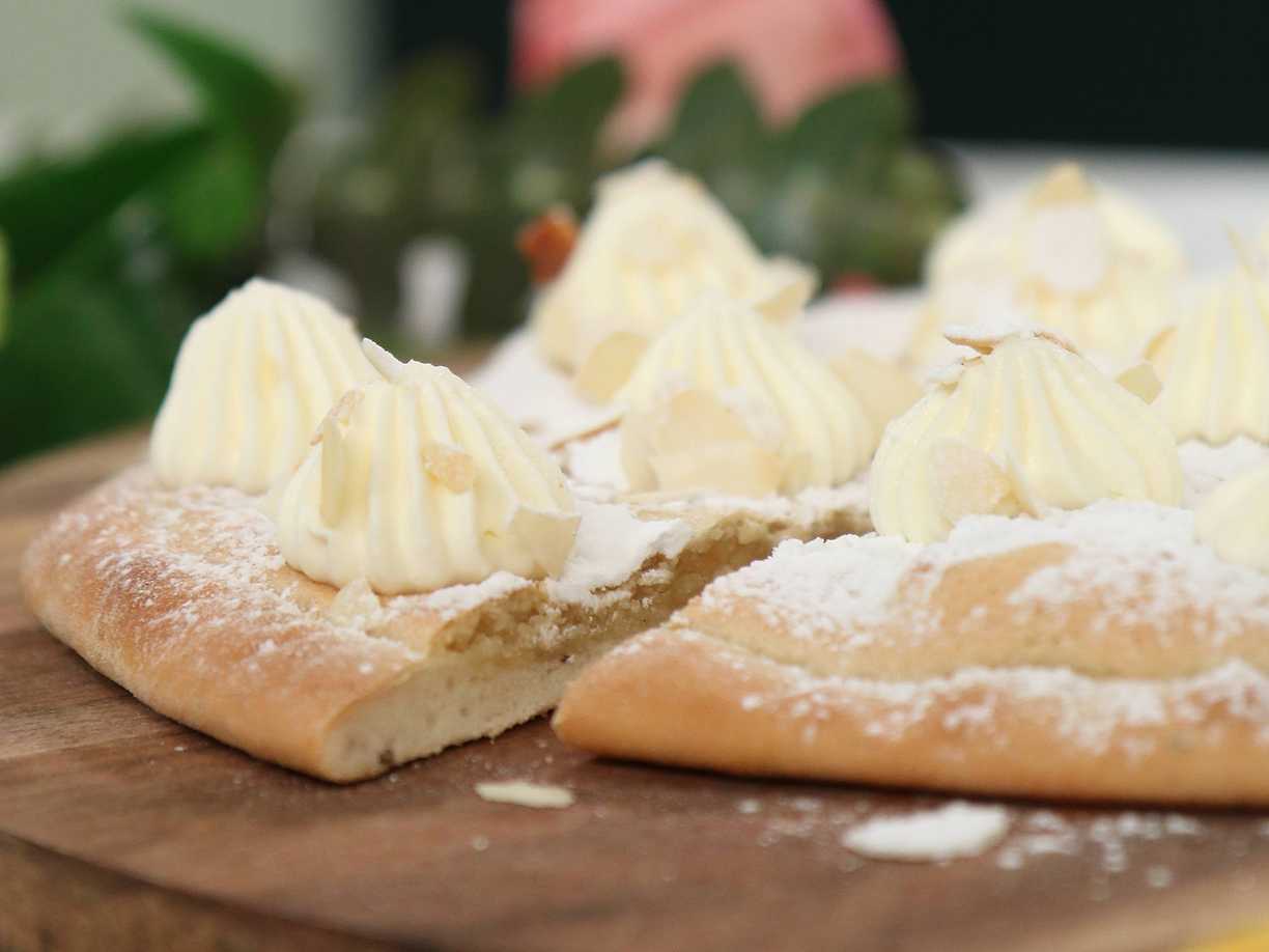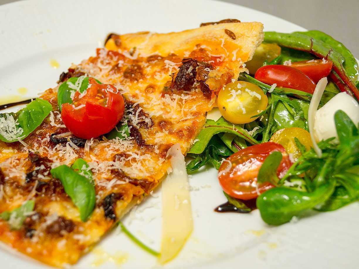 Pizza bianca med soltorkade tomater, vitost och rödlök