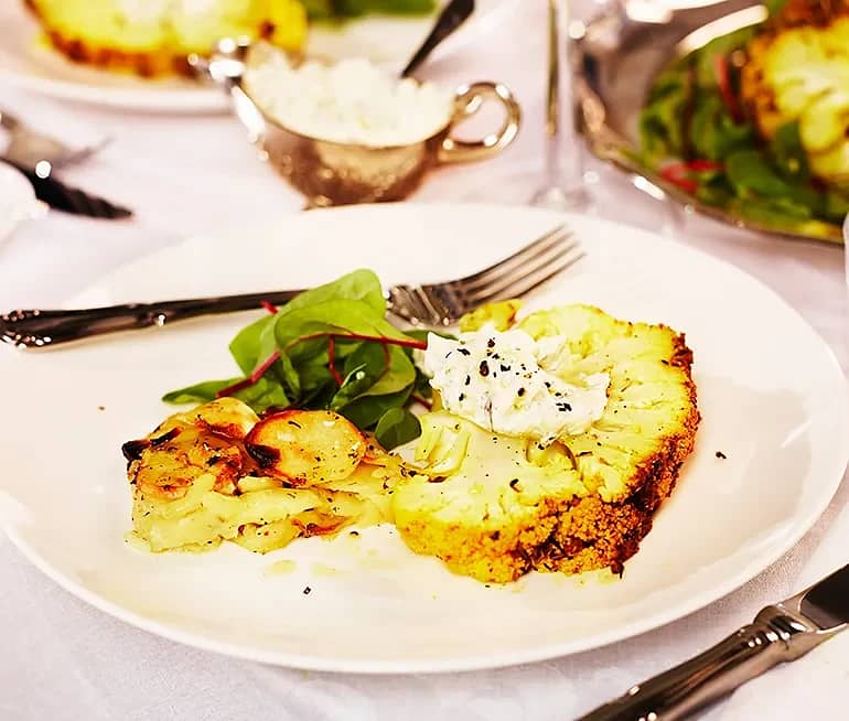 Örtbakad blomkål med fuskbea och pommes Anna