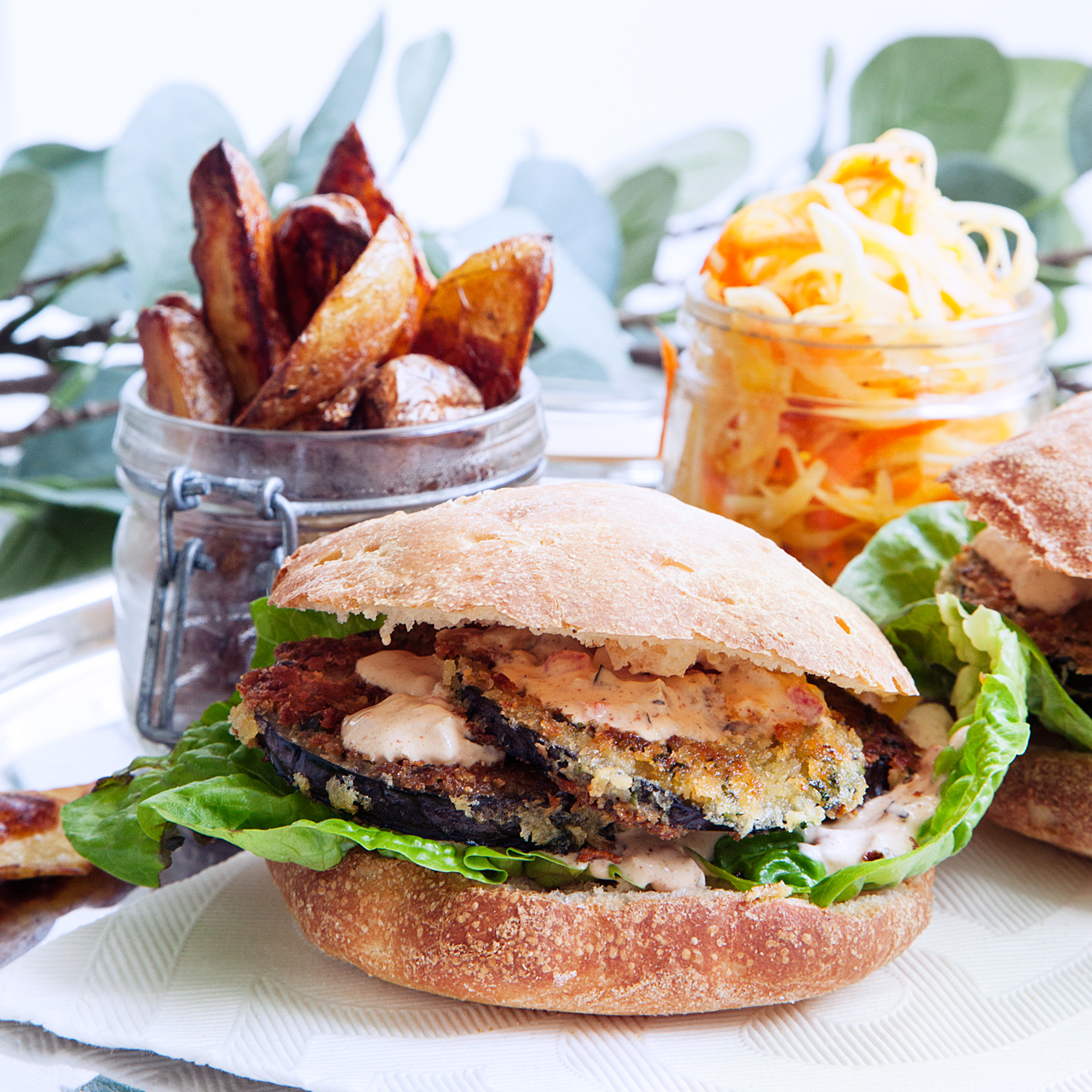 Frasig aubergineburgare med chipotledressing och pommes
