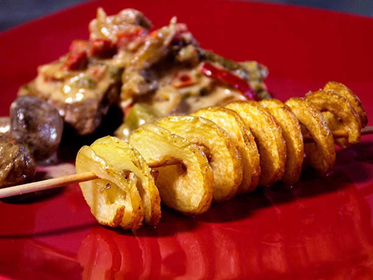 Fläskfilé med stekta grönsaker och skruvade pommes