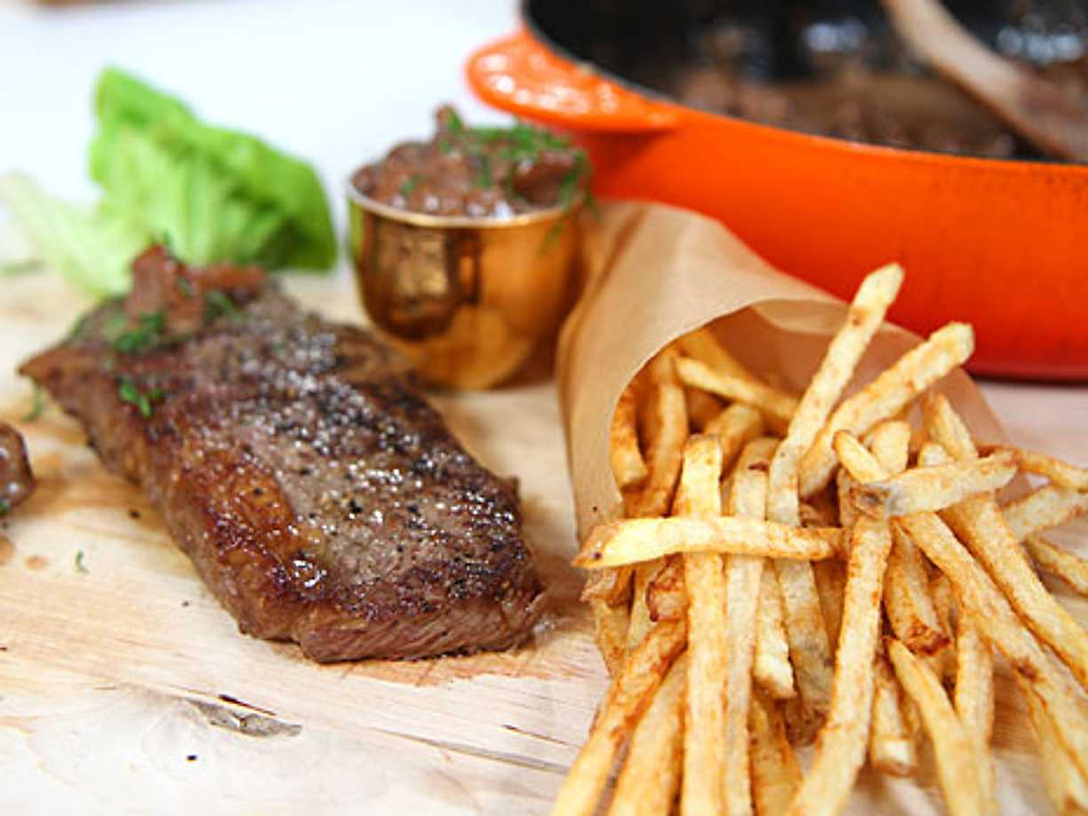 Leilas helstekta entrecote med chilibearnaise, bönor och hemgjorda pommes
