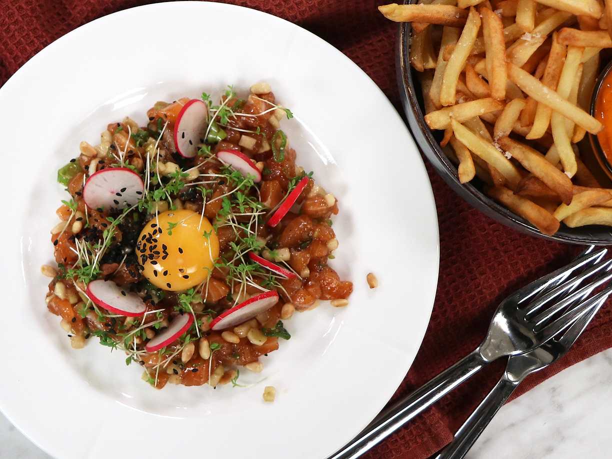 Koreansk laxtartar med pommes och het dipp