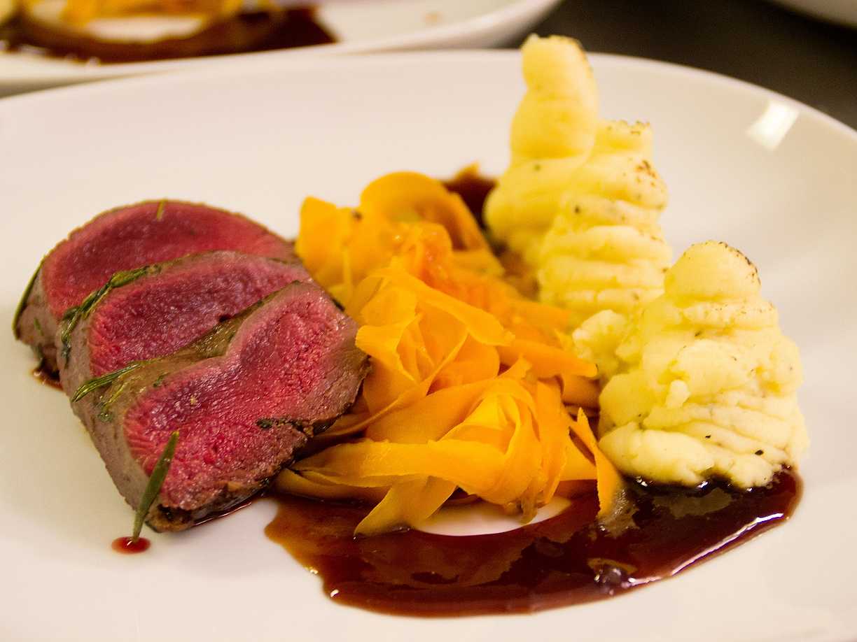 Renfilé med hjortronsås, vitvinskokta morötter och pommes duchesse