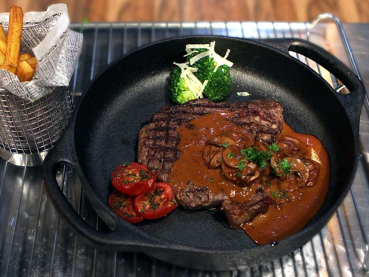 Steak Diane med pommes frites och champinjonsås
