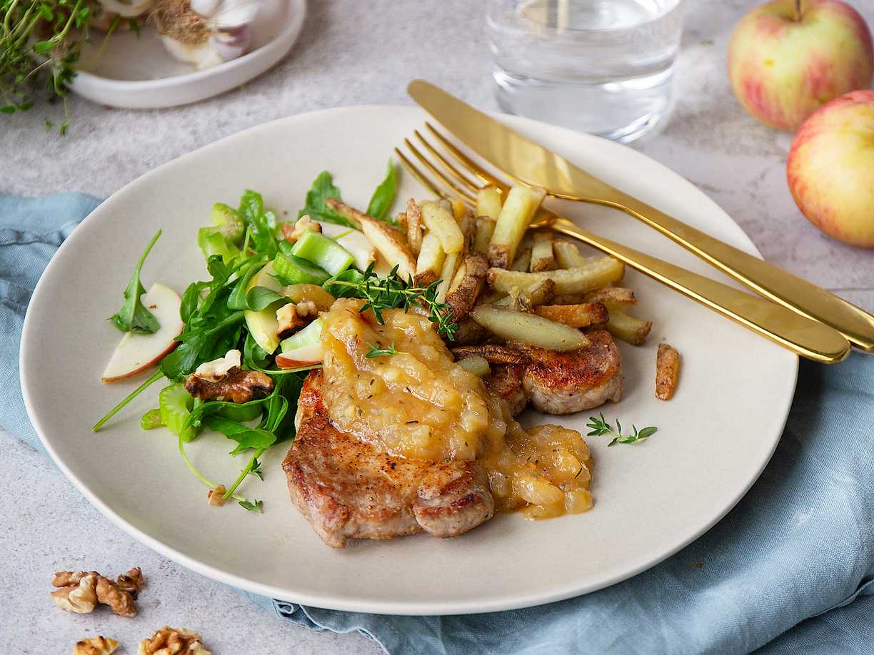 Stekta fläskkotletter med äppelchutney och pommes